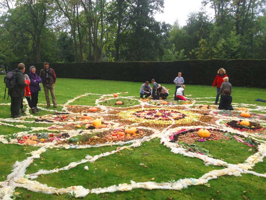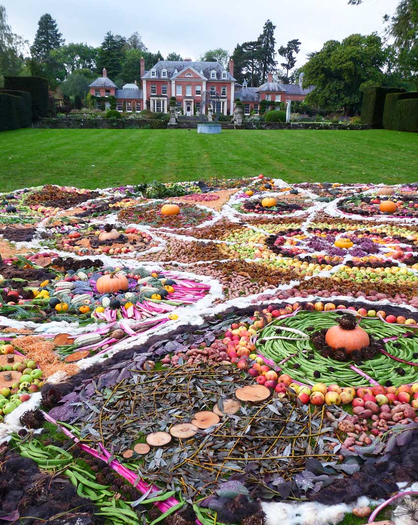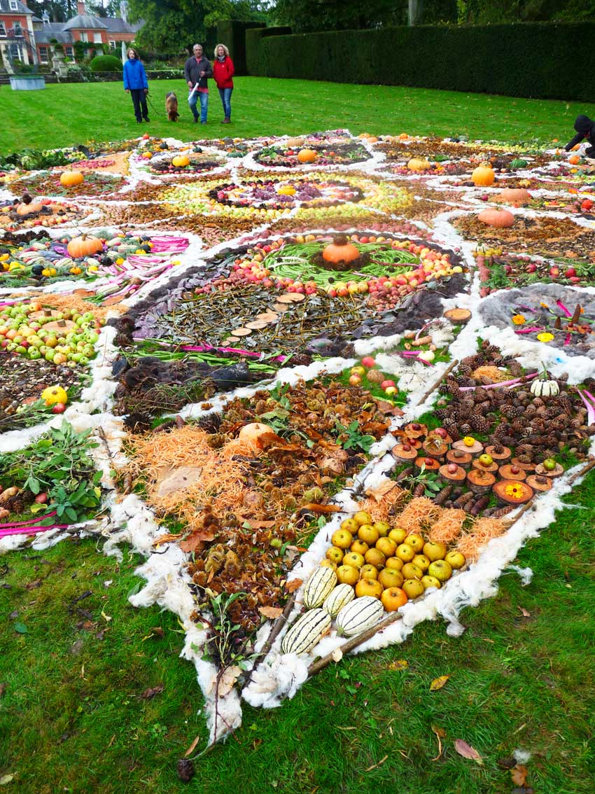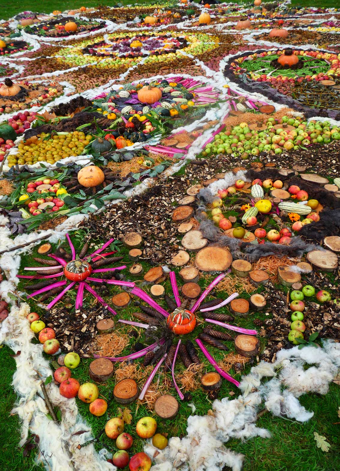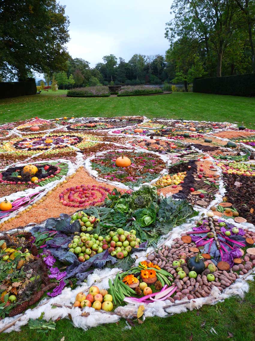This community drawing was held as part of the opening weekend of the Out of Nature Sculpture Exhibition at Newport House. The 50ft drawing was outlined using sheep’s wool and completed by c. 250 visitors during the opening weekend using the surplus fruits and vegetables, seeds and woodland produce harvested from the gardens and estate. The drawing emerged in response to the rhythm of the land and materials and celebrates the beauty of nature and enjoyment of working together in creative play.