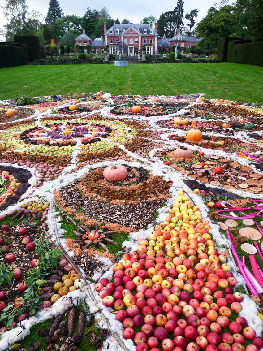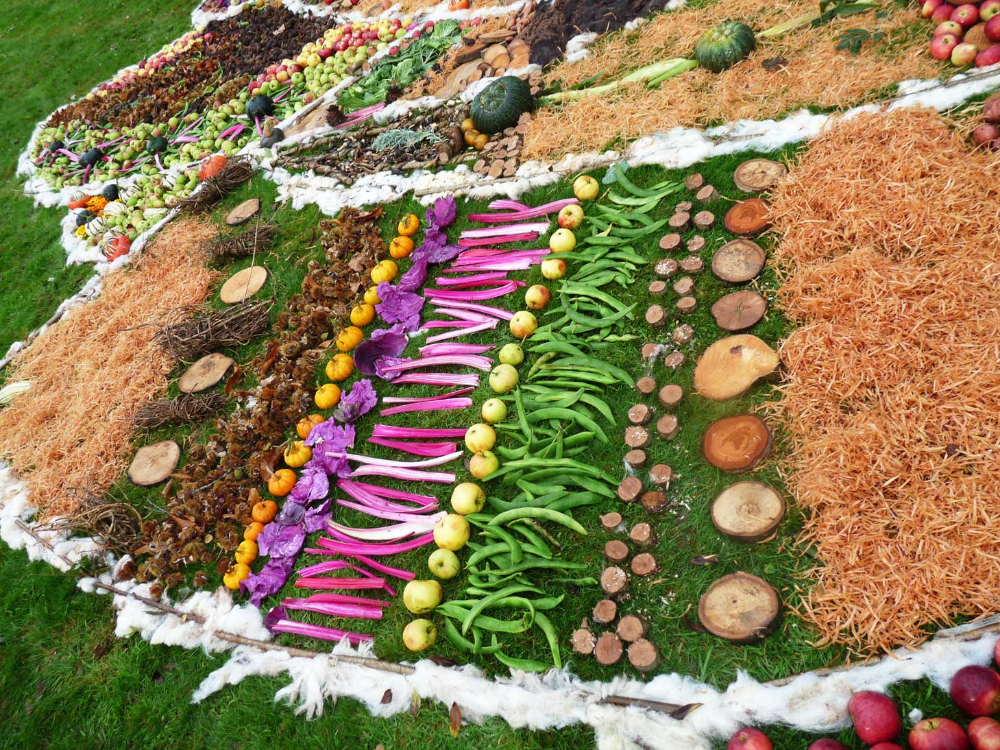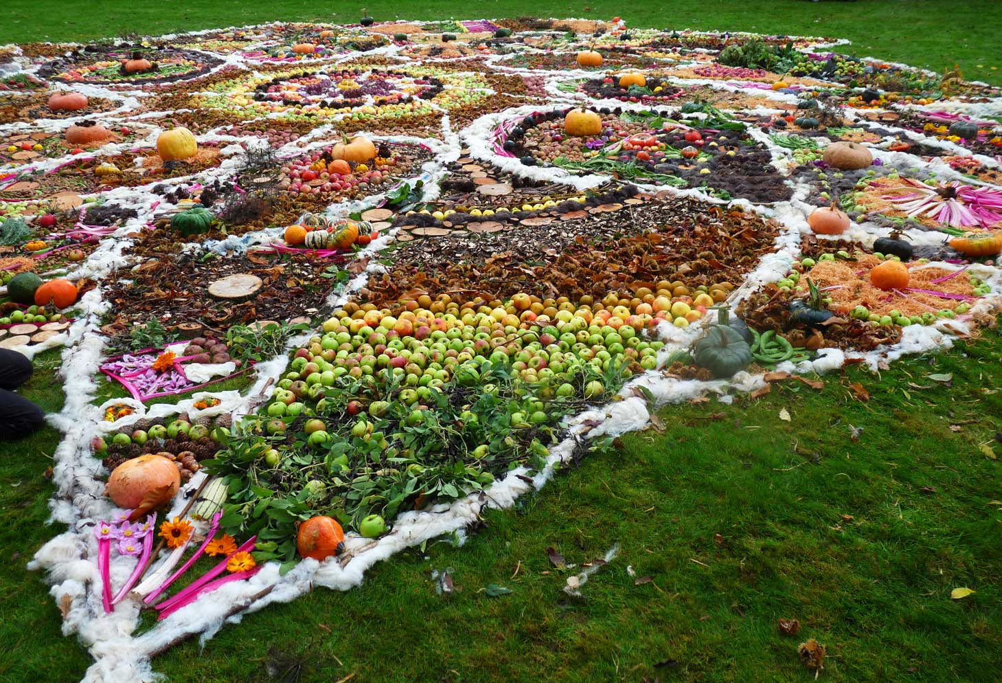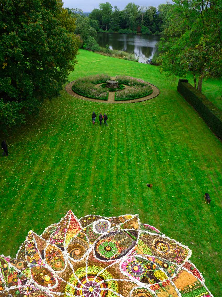 This community drawing was held as part of the opening weekend of the Out of Nature Sculpture Exhibition at Newport House. The 50ft drawing was outlined using sheep’s wool and completed by c. 250 visitors during the opening weekend using the surplus fruits and vegetables, seeds and woodland produce harvested from the gardens and estate. The drawing emerged in response to the rhythm of the land and materials and celebrates the beauty of nature and enjoyment of working together in creative play.