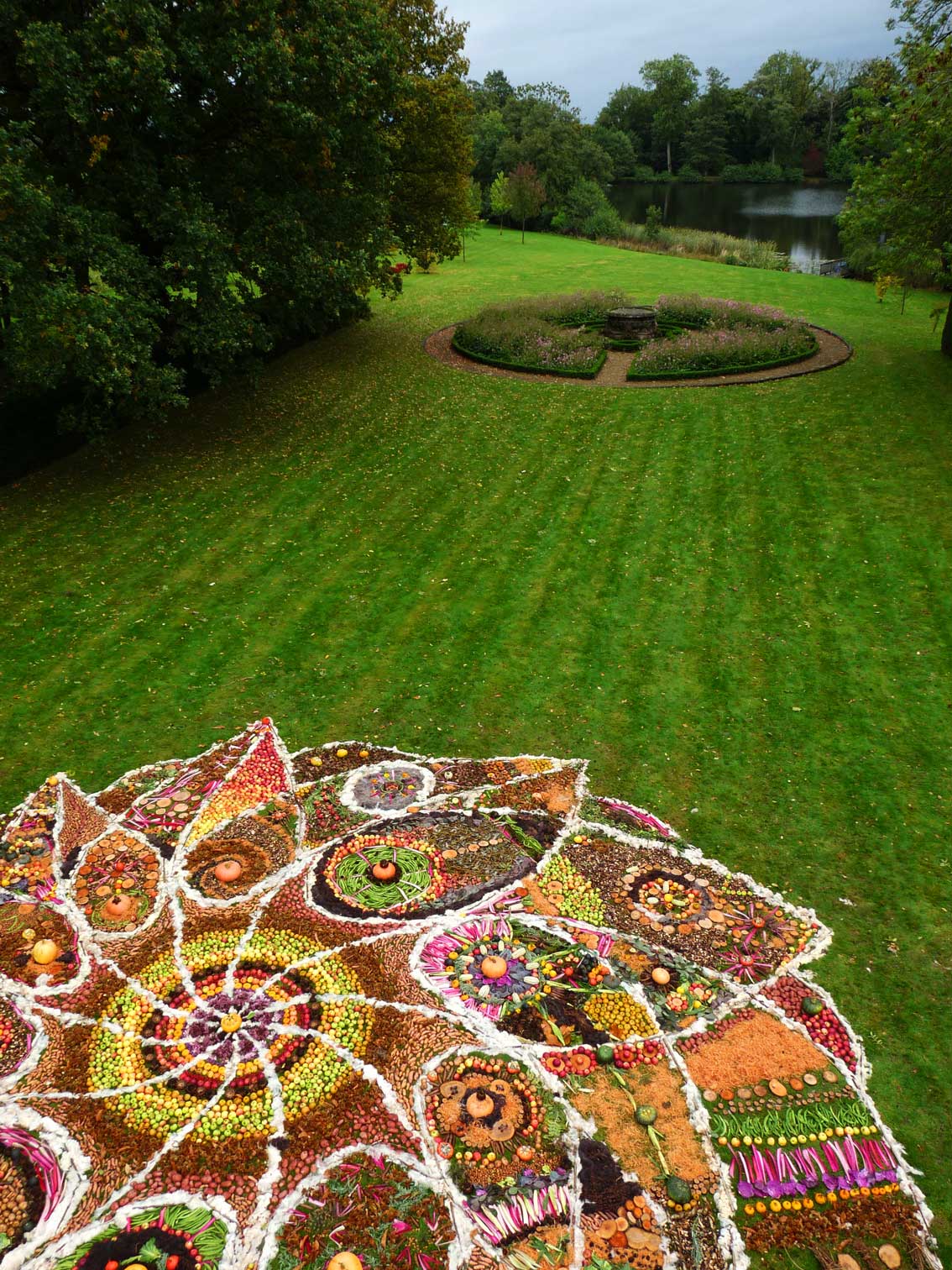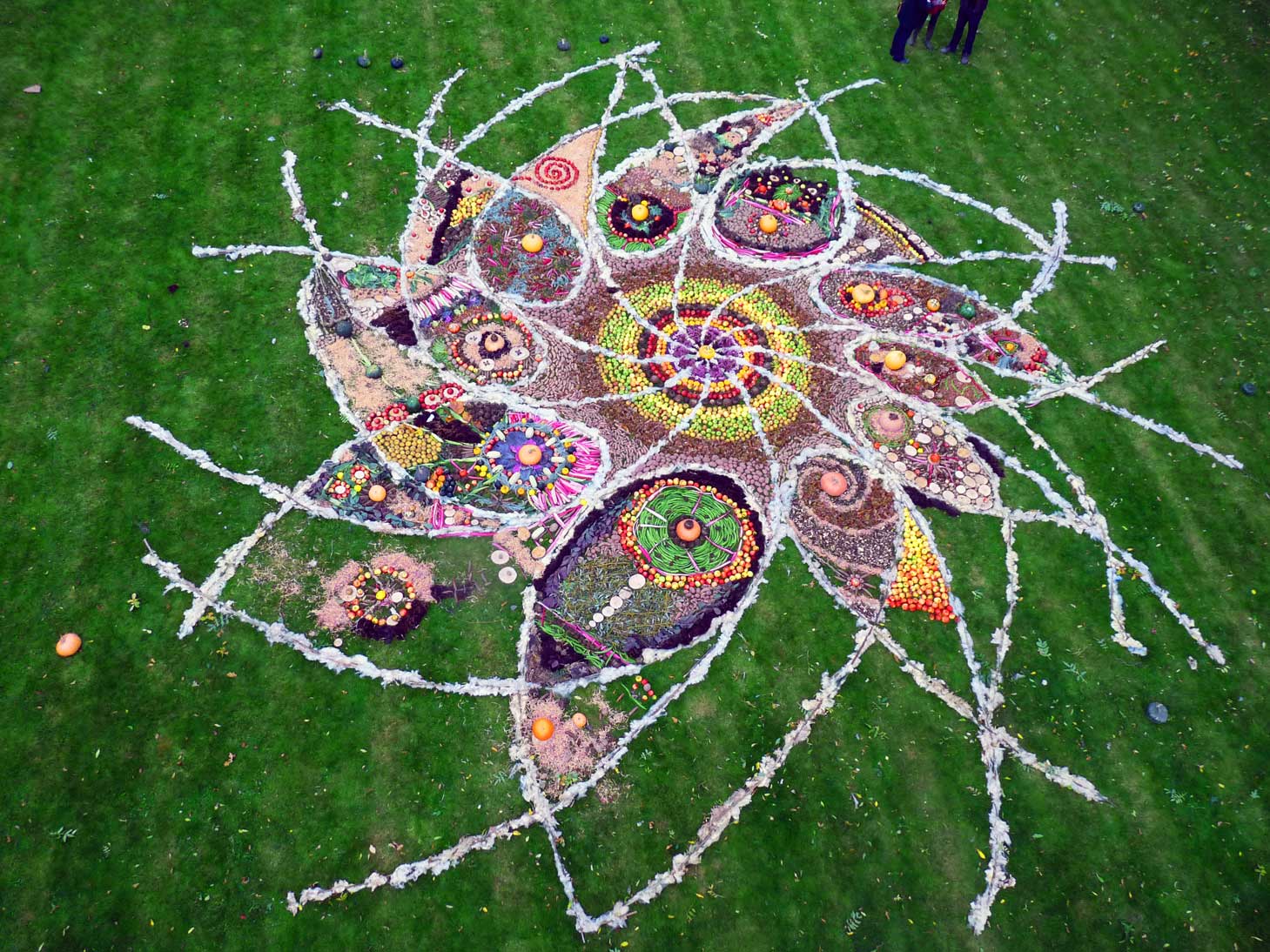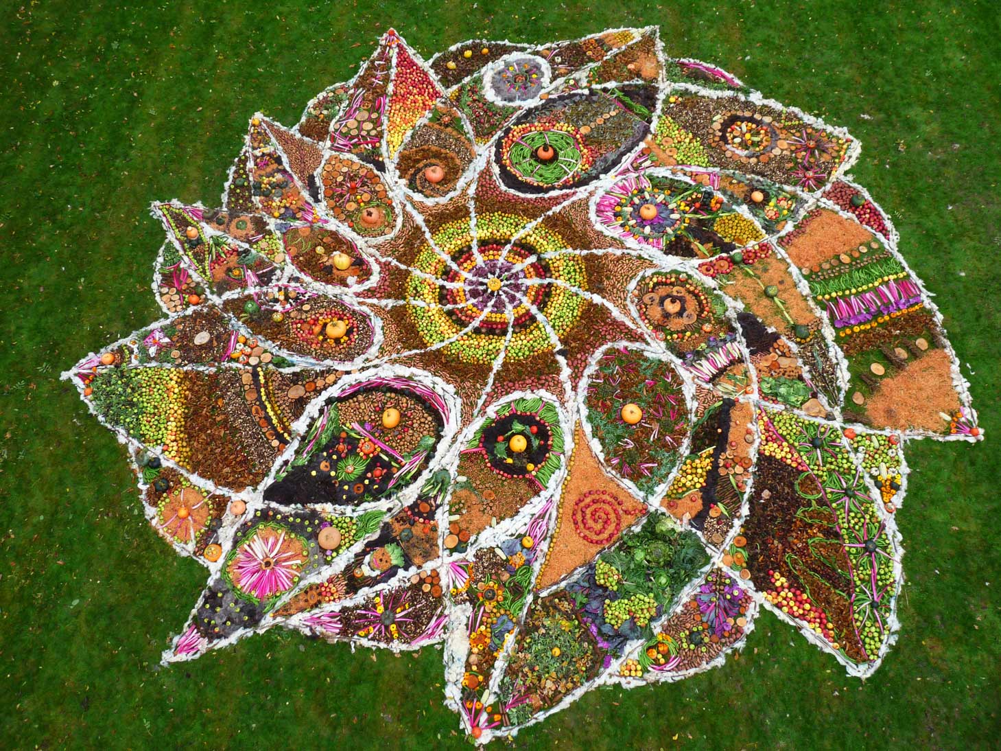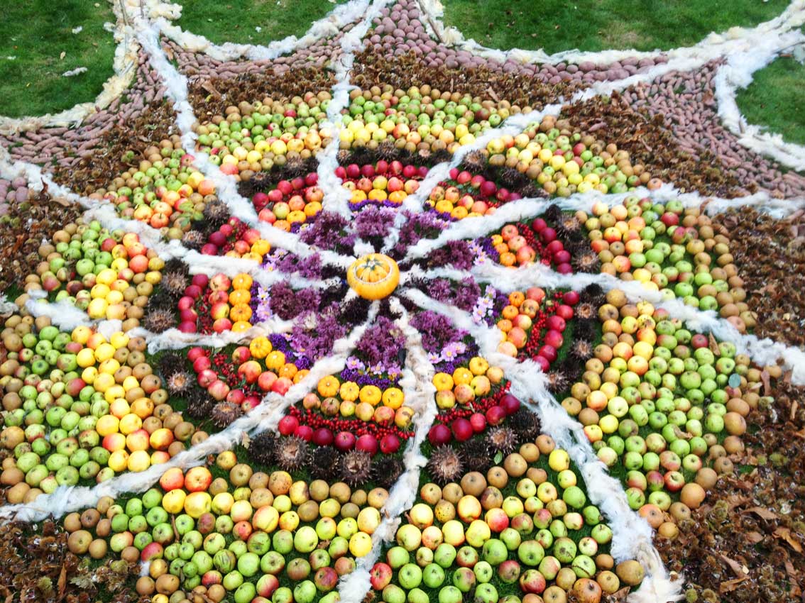 This community drawing was held as part of the opening weekend of the Out of Nature Sculpture Exhibition at Newport House. The 50ft drawing was outlined using sheep’s wool and completed by c. 250 visitors during the opening weekend using the surplus fruits and vegetables, seeds and woodland produce harvested from the gardens and estate. The drawing emerged in response to the rhythm of the land and materials and celebrates the beauty of nature and enjoyment of working together in creative play.